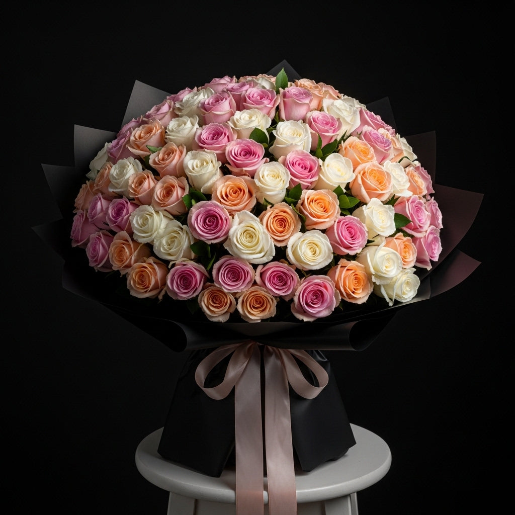 An extraordinary bouquet featuring 50 soft pink roses, 50 elegant peach roses, and 50 classic white roses, beautifully arranged into a grand, full display and wrapped in premium black paper with a refined satin ribbon finish.